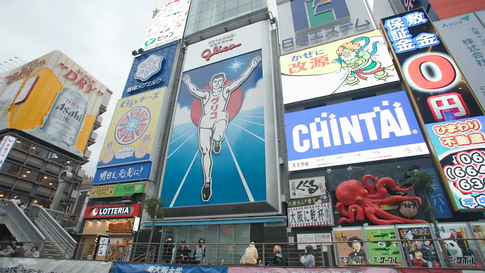 도톤보리의 간판 아래 이어지는 맛집 골목과 우메다의 스카이라인,